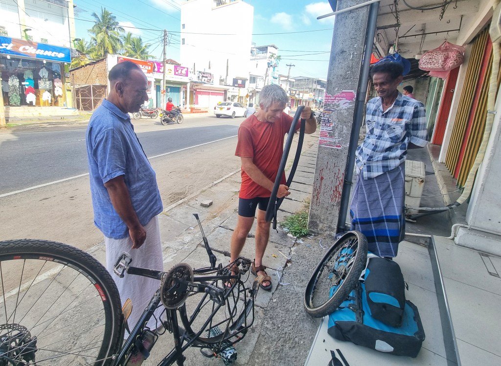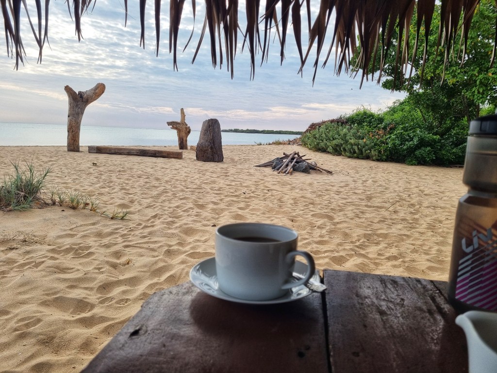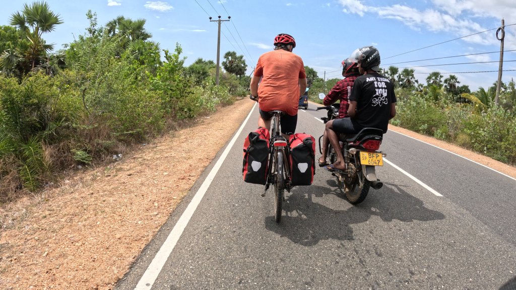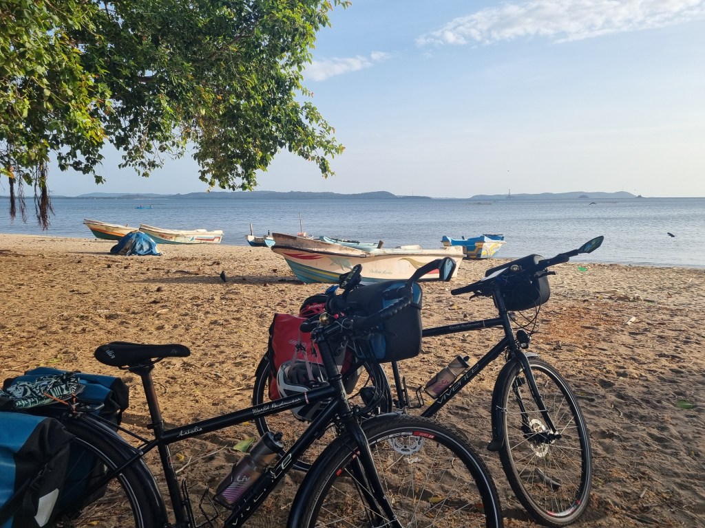 Just a short ride today to the next seaside town of Pasikuda. A few fun interactions along the way today…from lengthy convos with passing moto drivers, to an accidental stop at a little dirt road corner stall…persuaded by two cute kids. Not the most smart move on our part, we were somehow railroaded into two glasses of “juice” which were actually some sort of cordial concentrate, with water poured from a container looking decidedly green around the edges and ice that was definitely not on the “safe to consume” list. So if you don’t here from us for any extended period maybe assume that our folly caught up with us…but so far so good!