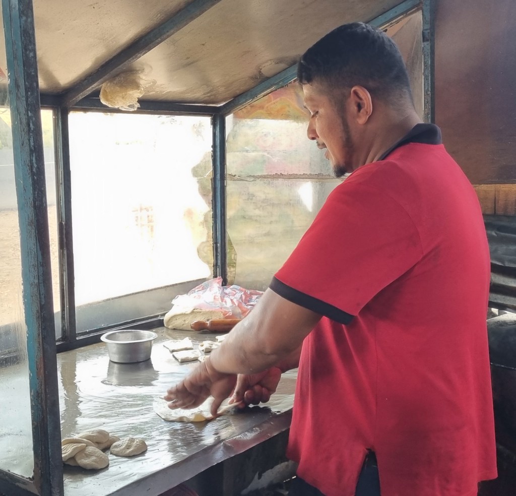 Second brekky today was another tiny roadside stall serving hot of the press rotis with curry…another chance for Neil to continue his quest to rate the Dahls of Sri Lanka. And ’twas a mighty good one too…