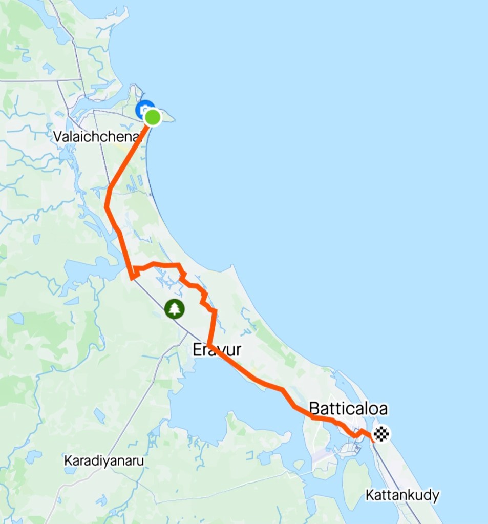 Today’s ride was a bit of a hard slog- even though fairly flat, it was into the wind most of the way, with some very varied road surfaces (quite a bit of road works in progress too). It was quite a relief to get to Vakarai by around midday and have the afternoon to explore.