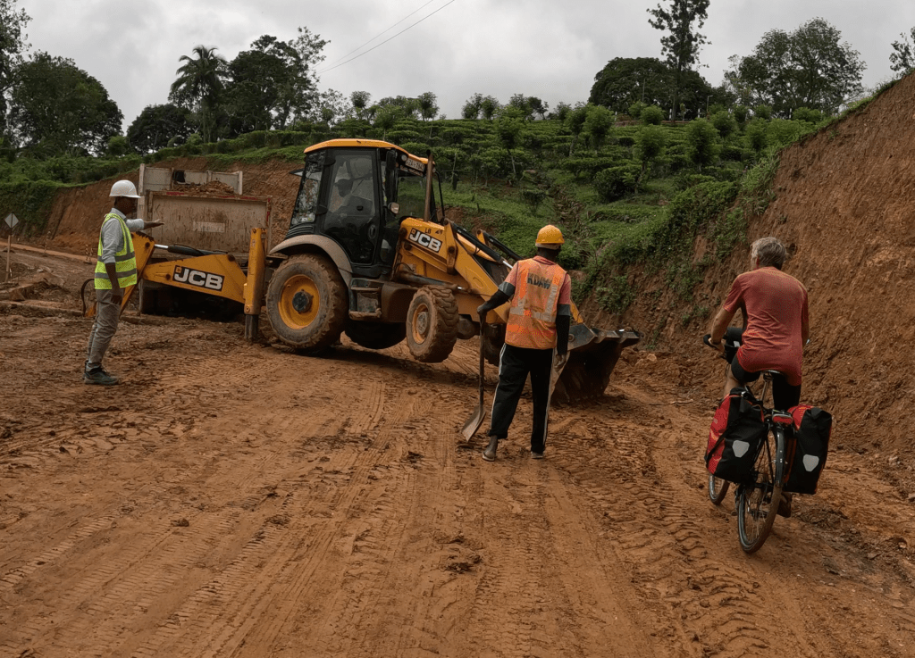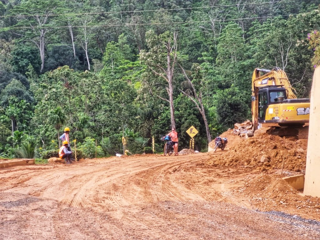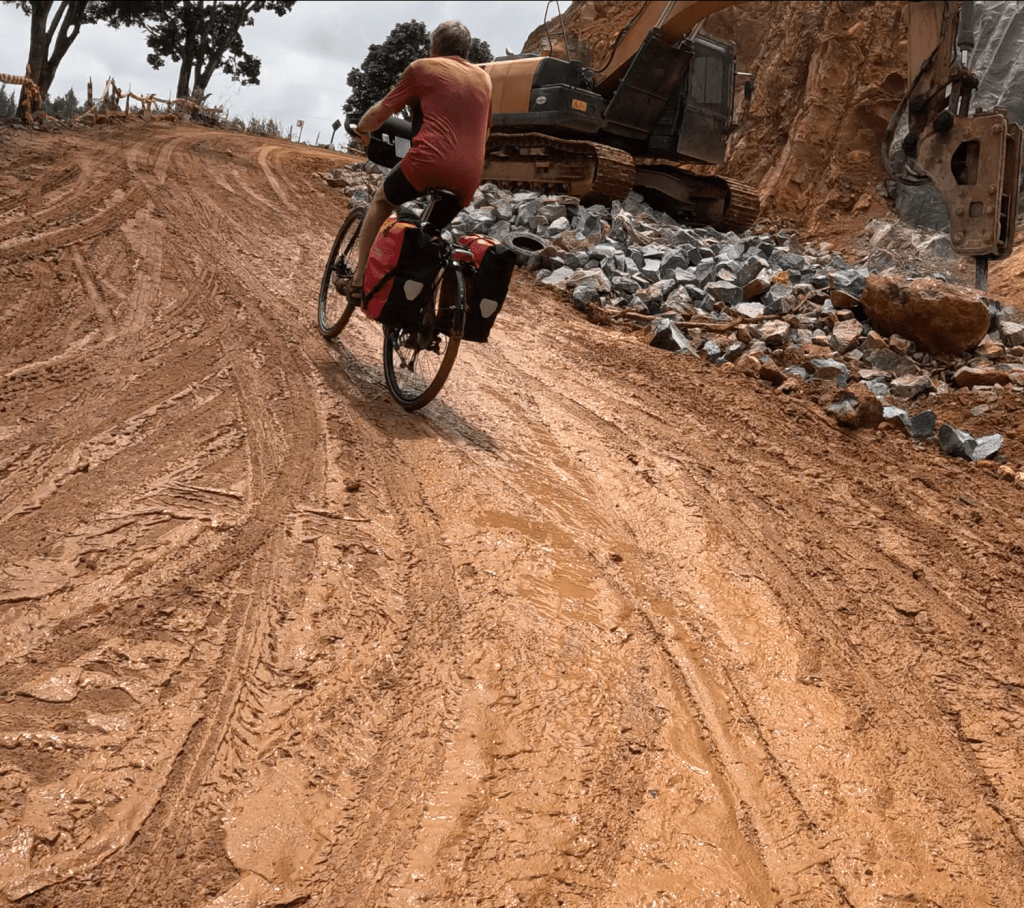 So off we set with full tummies for what we knew would be quite a bit of “up”. What we didn’t know was that our chosen route, zig zagging up a mountain pass, was also a major construction site… non-stop roadworks, mud, more mud and heavy machinery for about 15km. This was after navigating through some tiny sandy paths on the “shortcut” to the highway, so we really didn’t do well with our planning today!