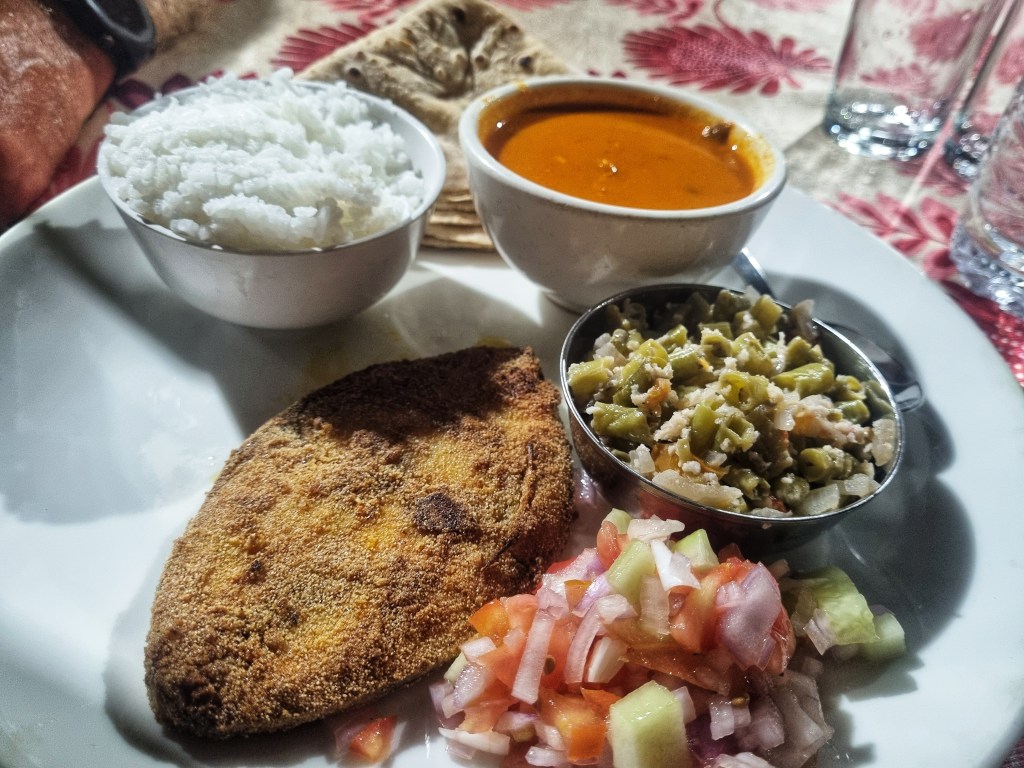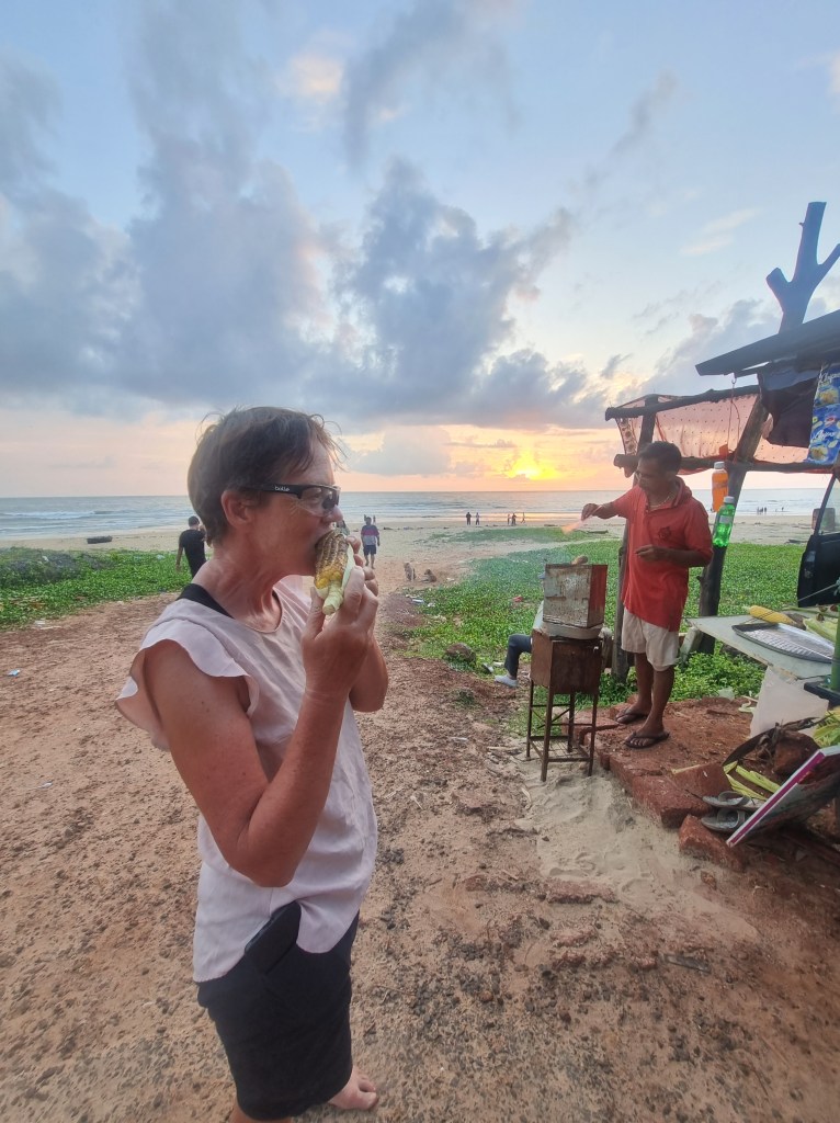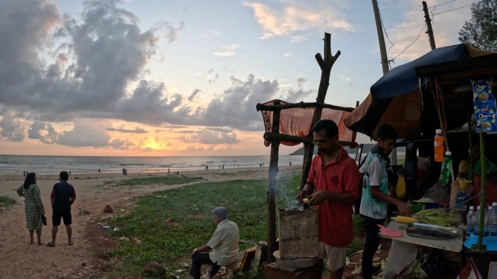 Not many options for food but the hotel restaurant was opening later in the evening. Thankfully we found a vendor selling BBQ sweetcorn on the beach to tide us through until the hotel’s restaurant opened at 9.00pm!!. The menu was fish thali, considerably better than we were expecting: the kitchen was on open view on check-in and a melange of chickens, cats and dogs seemed to roam freely. Very hygienic indeed…
