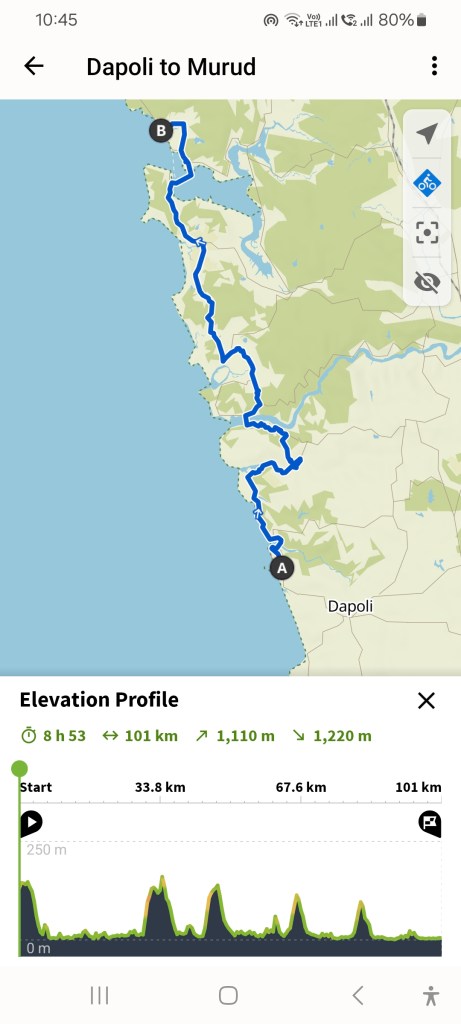 Mid afternoon, was feeling a little better and we decided to push on so that we could make Mumbai the following day. Still amazing coastal scenery, lush tropical forest right down to the now black sand beaches. Through occasional small towns, some of these were utterly filthy, rubbish everywhere 😦
