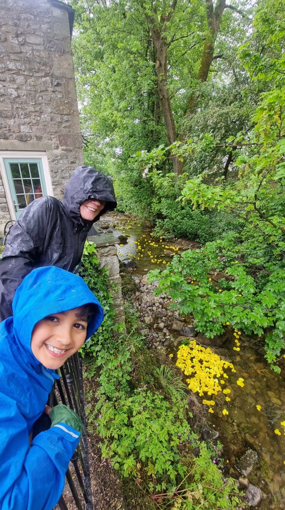 Coincidentally our stay at Kettlewell coincided with the annual “Duck Race”- kinda like a raffle but we got to barrack for a numbered plastic duck. Something like 10000 ducks started the race upstream, and we waited with a great air of expectation, along with plenty of other equally excited folks. Tabitha and Isaac, Neil’s niece/nephew had a great time waiting for the ducks to arrive…but none of us could quite manage to wait it out to the finish line, they were just too slow! Pretty sure a whole heap of ducks didn’t make it. The river level was quite low due to the dry conditions…although we did stand watching in the rain for the best part of an hour.