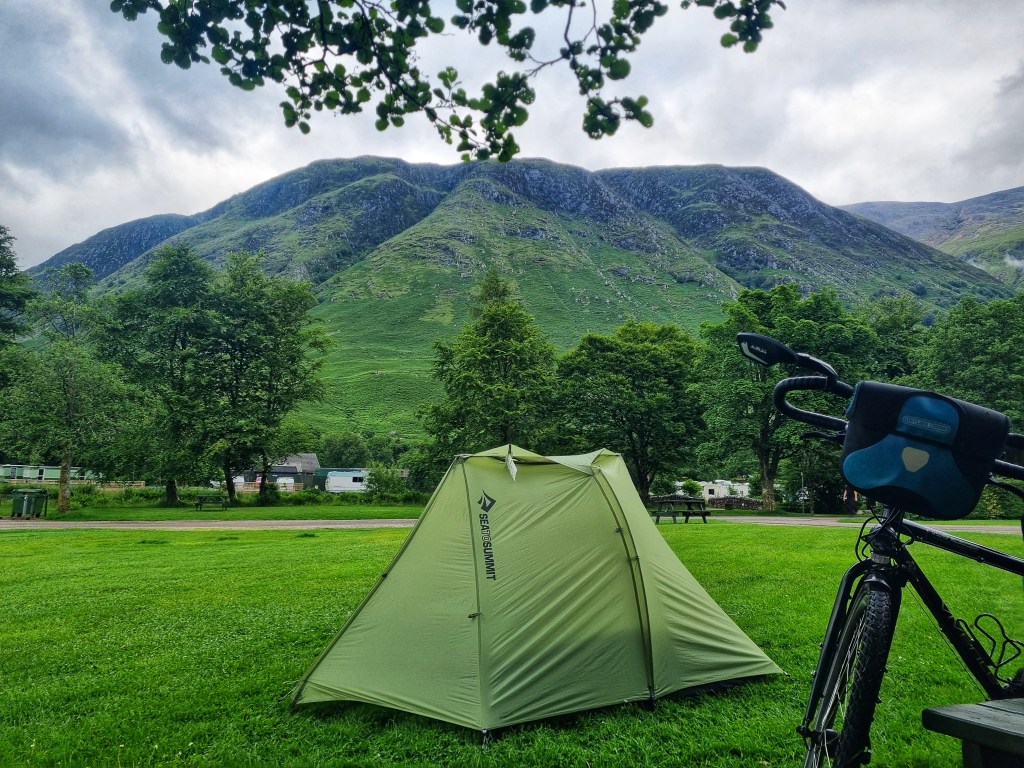 Camping in a whopping big site at Glen Nevis, with a lovely hillside view 🙂