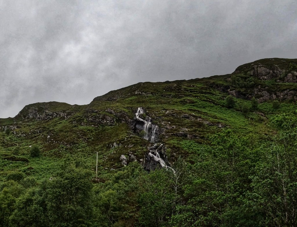 A tough day. Wet weather gear on before we got out of the tent, and an early start to catch the first ferry across the Loch from Fort William so that we could cycle on the quieter roads south.