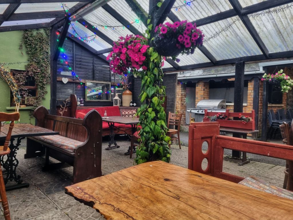 We’ve camped in a field at the back of a “pub” in the tiny village of Lorrha. The Pub’s not open today, haven’t seen another soul and its pouring with rain! But there’s a (mostly) covered area that’s pretty cool and quirky. It must be bustling on the weekend opening days, and it served us well as a shelter from the weather.