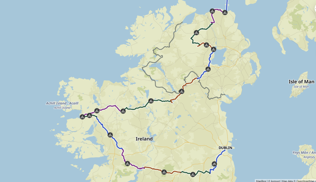 A lovely scenic route around the lakes, then a hair raising entry to Ireland’s capital. Didn’t seem to be a lot of care or concern for cyclists despite so-called ‘cycle lanes’- they were quite heavily utilised by intolerant car drivers, until we reached the centre of the city where it’s a different story altogether! Dedicated cycle lanes and even traffic lights just for cyclists. You just have to make it in to the city in one piece first 🤷♀️