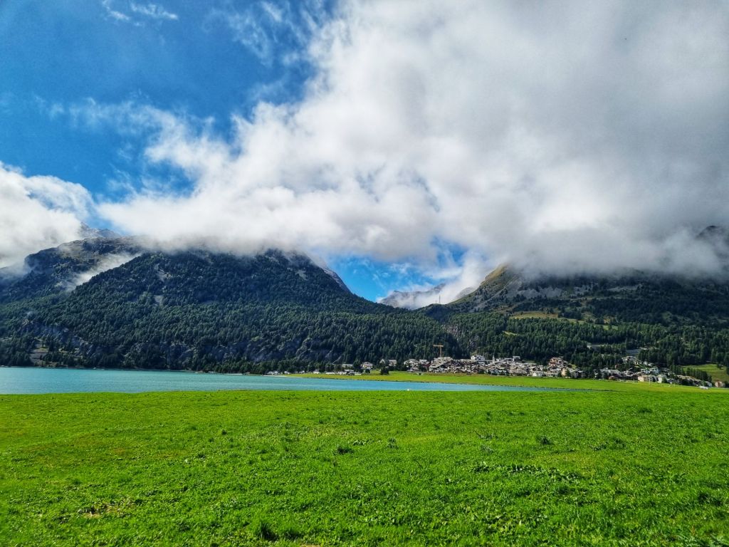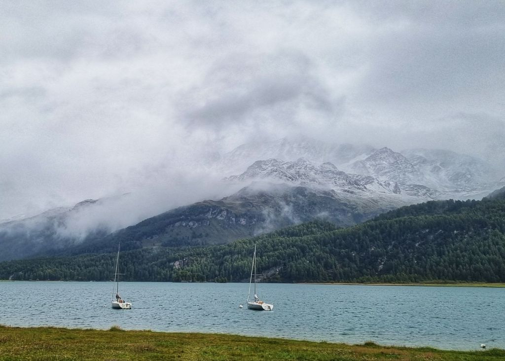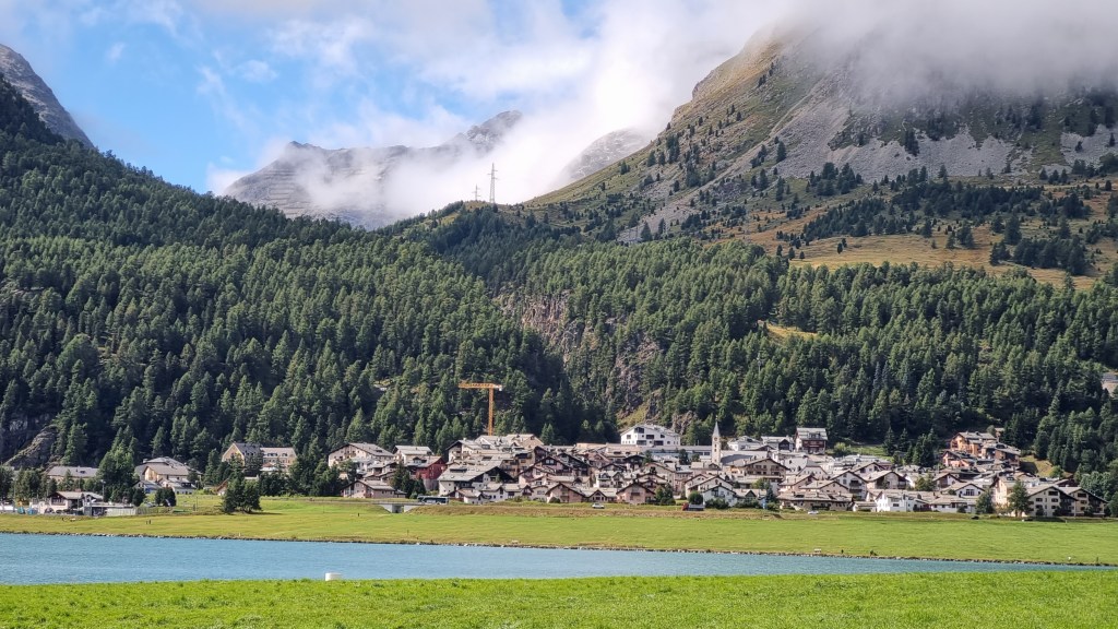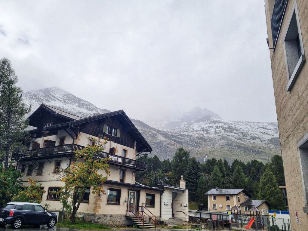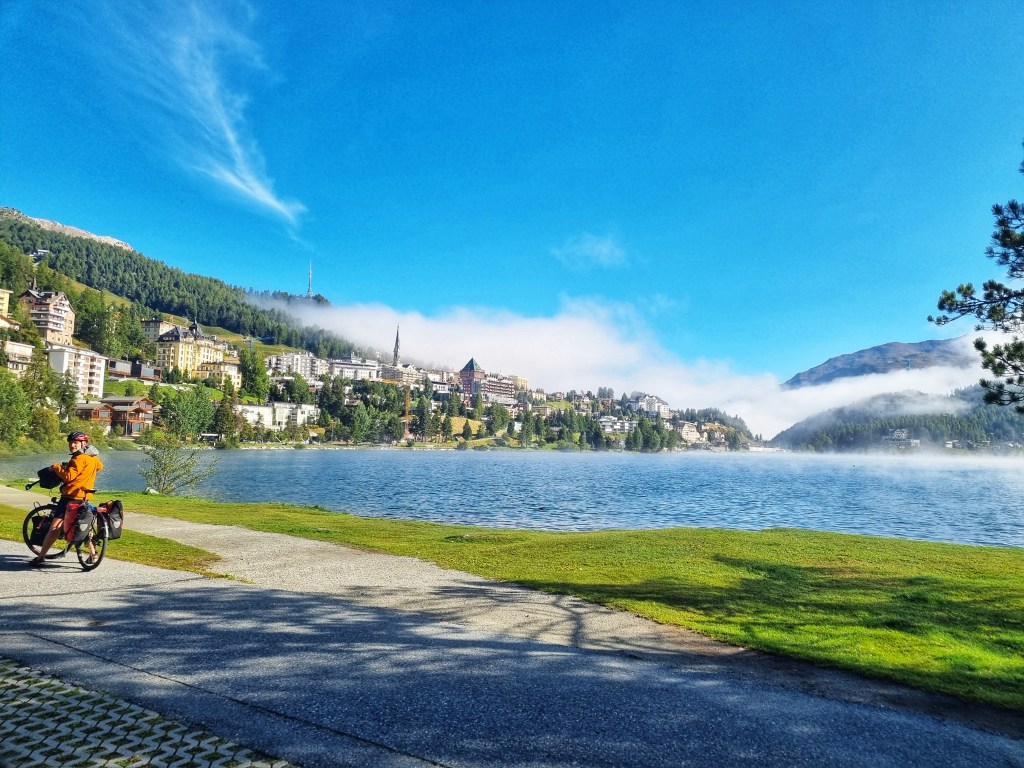 After a day of freezing, stormy conditions we arrived at the St Moritz campsite- a very upmarket site with exceptional new amenities, but a bit of a mud puddle and newly established grass to pitch our tent. And, the coldest night we’ve had so far- 0 degrees overnight and plenty of fog so a little difficult to stay warm!! Thank goodness for a warm common area- we made very good use of it!