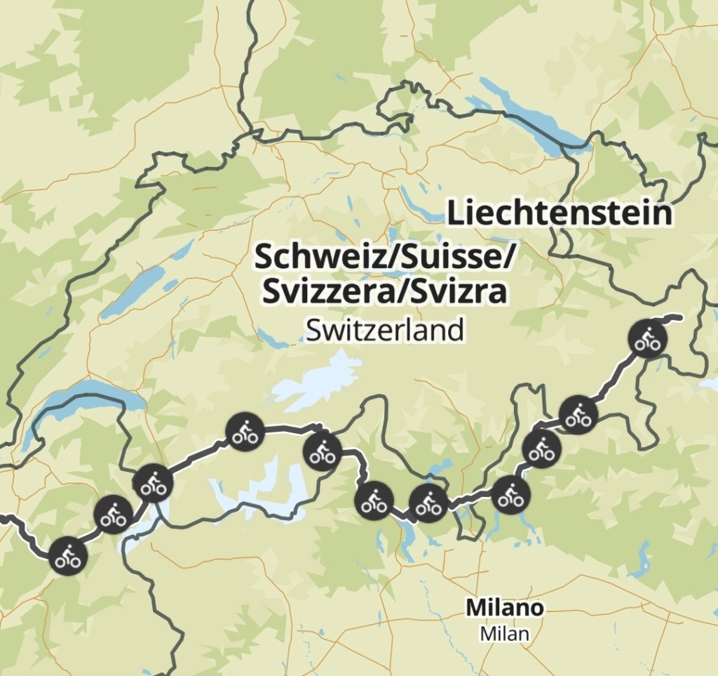 Another day of spectacular Swiss scenery, just everywhere we looked. Despite a nett gradual descent there seemed to be quite a lot of “up” to contend with today as well. I guess that’s what happens when you’re in the Alps 🤷♀️